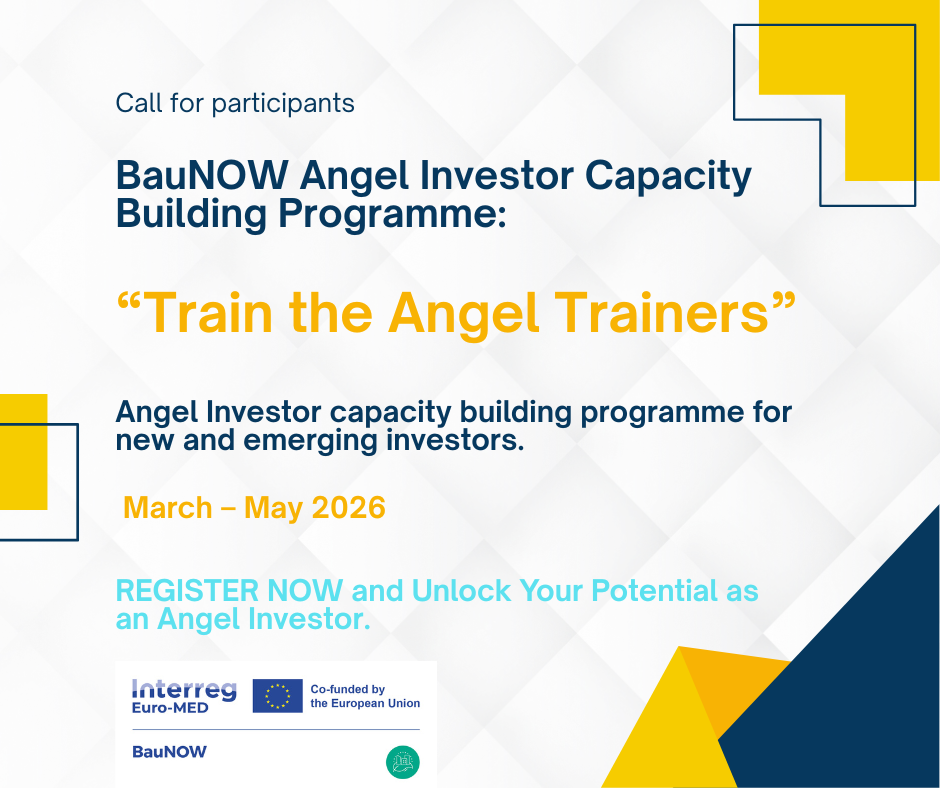 The programme is designed within the BauNOW project in response to identified ecosystem needs. The BauNOW project is helping territories across the Euro-MED area turn green ambitions into real, financed action. One stubborn bottleneck is early-stage “smart capital” – funding (and know-how) that helps promising startups cross the infamous “valley of death” and actually scale.